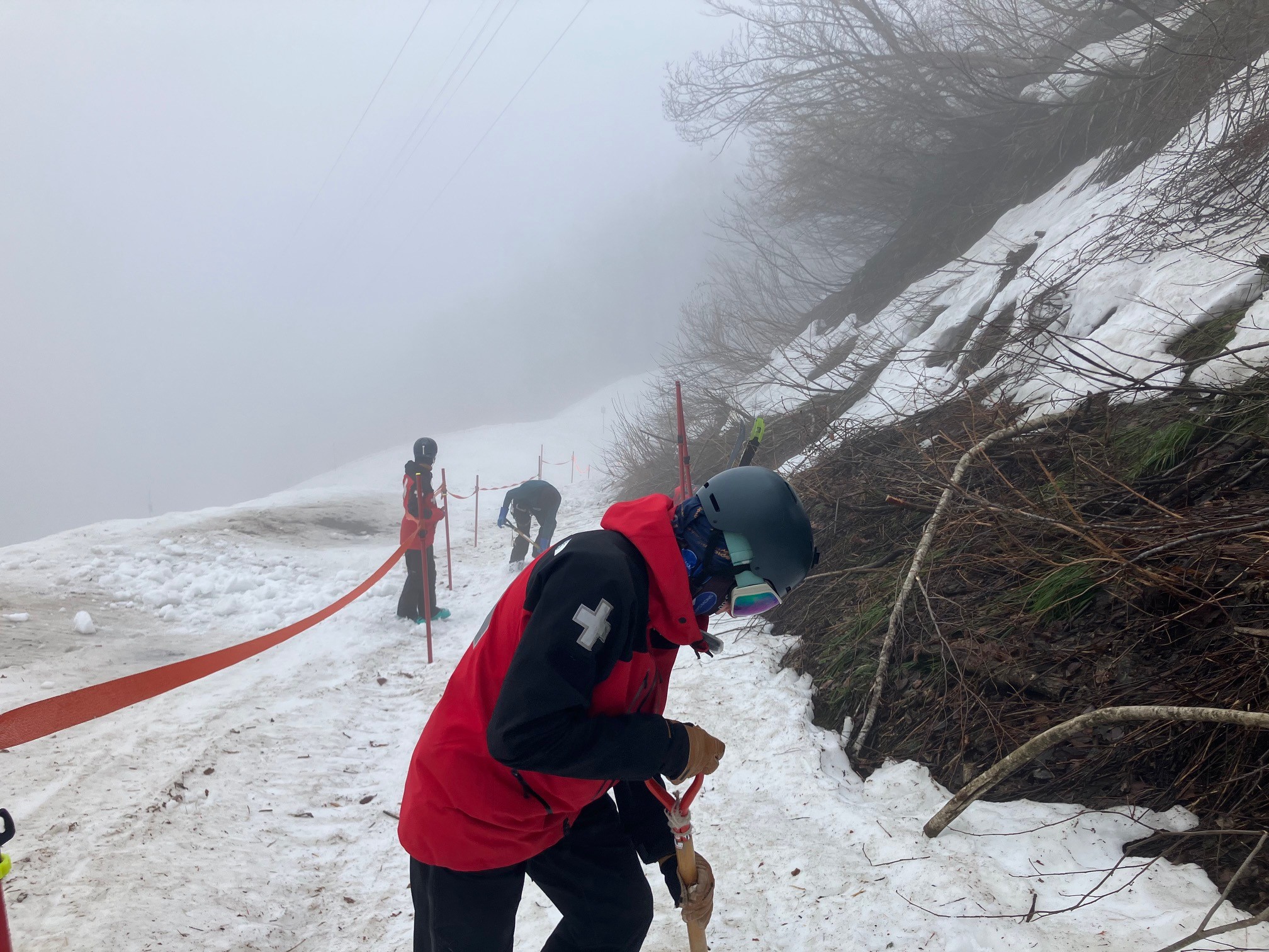 薄くなってしまったコースに、ひたすら雪を運んで均していく地道な作業。
