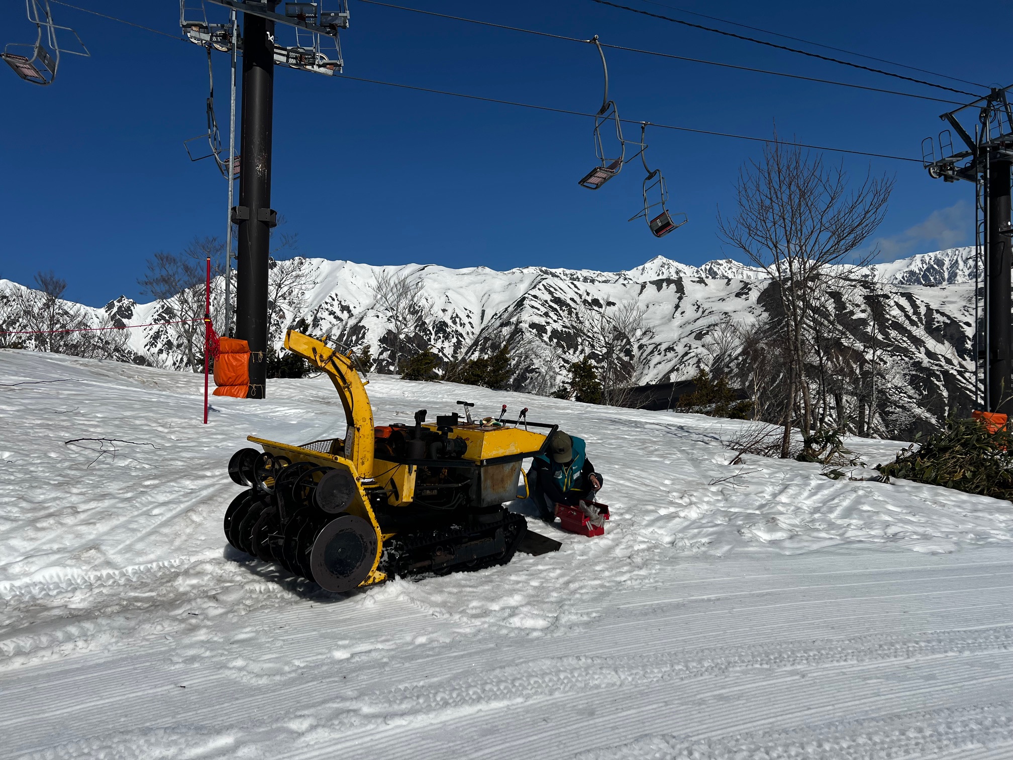こちらではそんな狭間の白馬ブルーのもと、リフトマンのヒゲ館長が投雪機を修理しています。