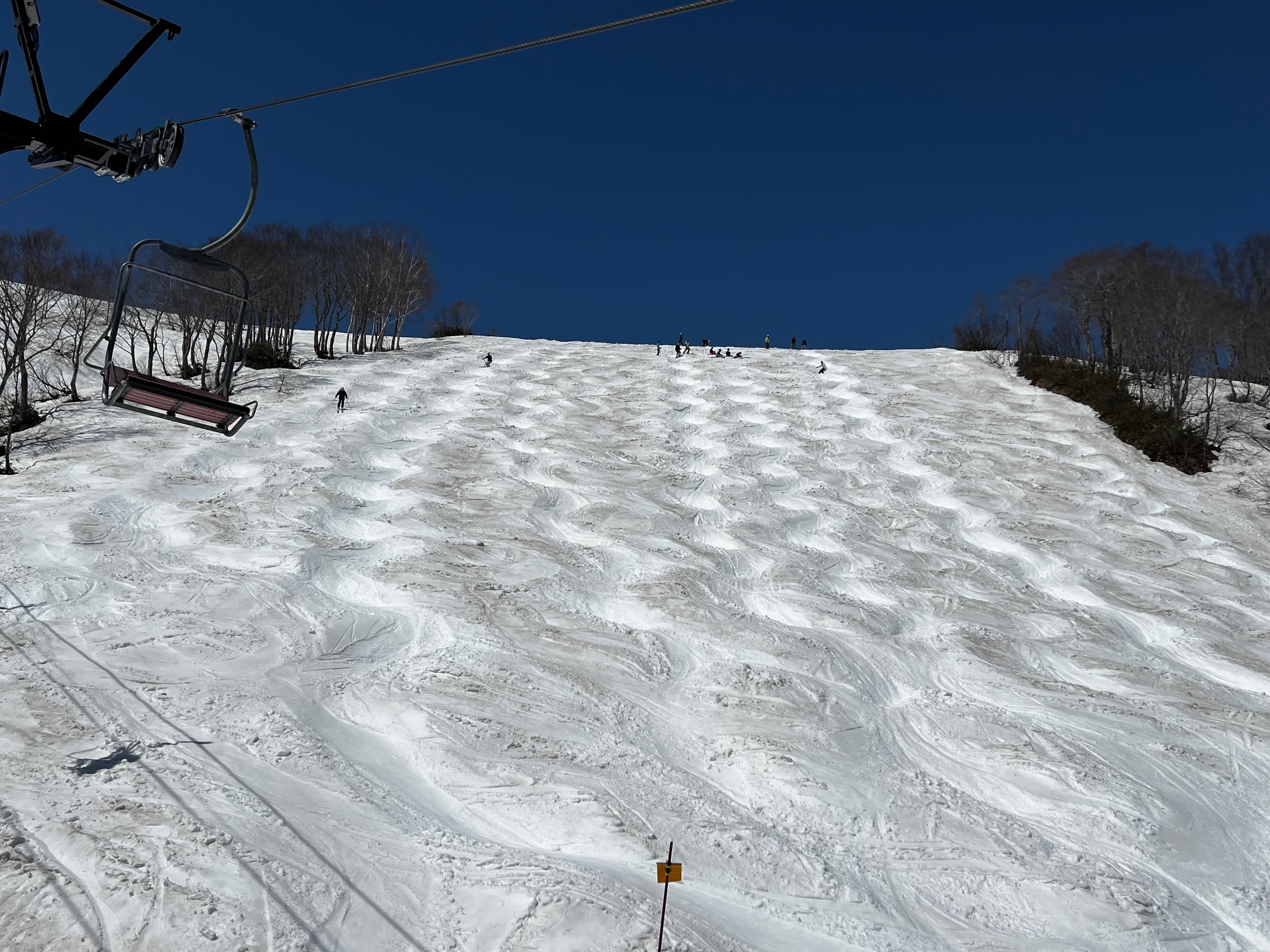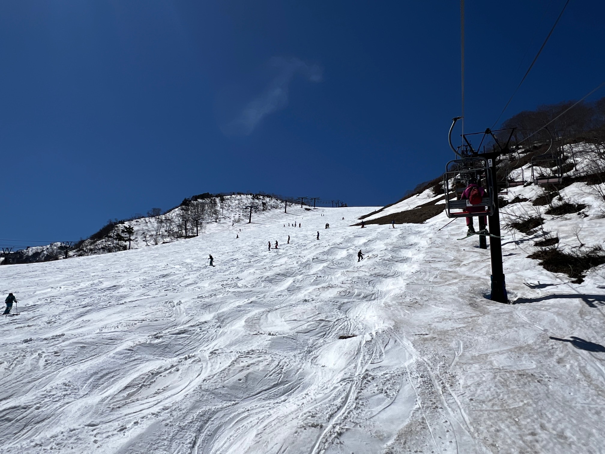 座るリフト搬器の太腿をじりじりと太陽が照りつけ、終点に到着する頃には、もも肉の照り焼きが出来上がっています。