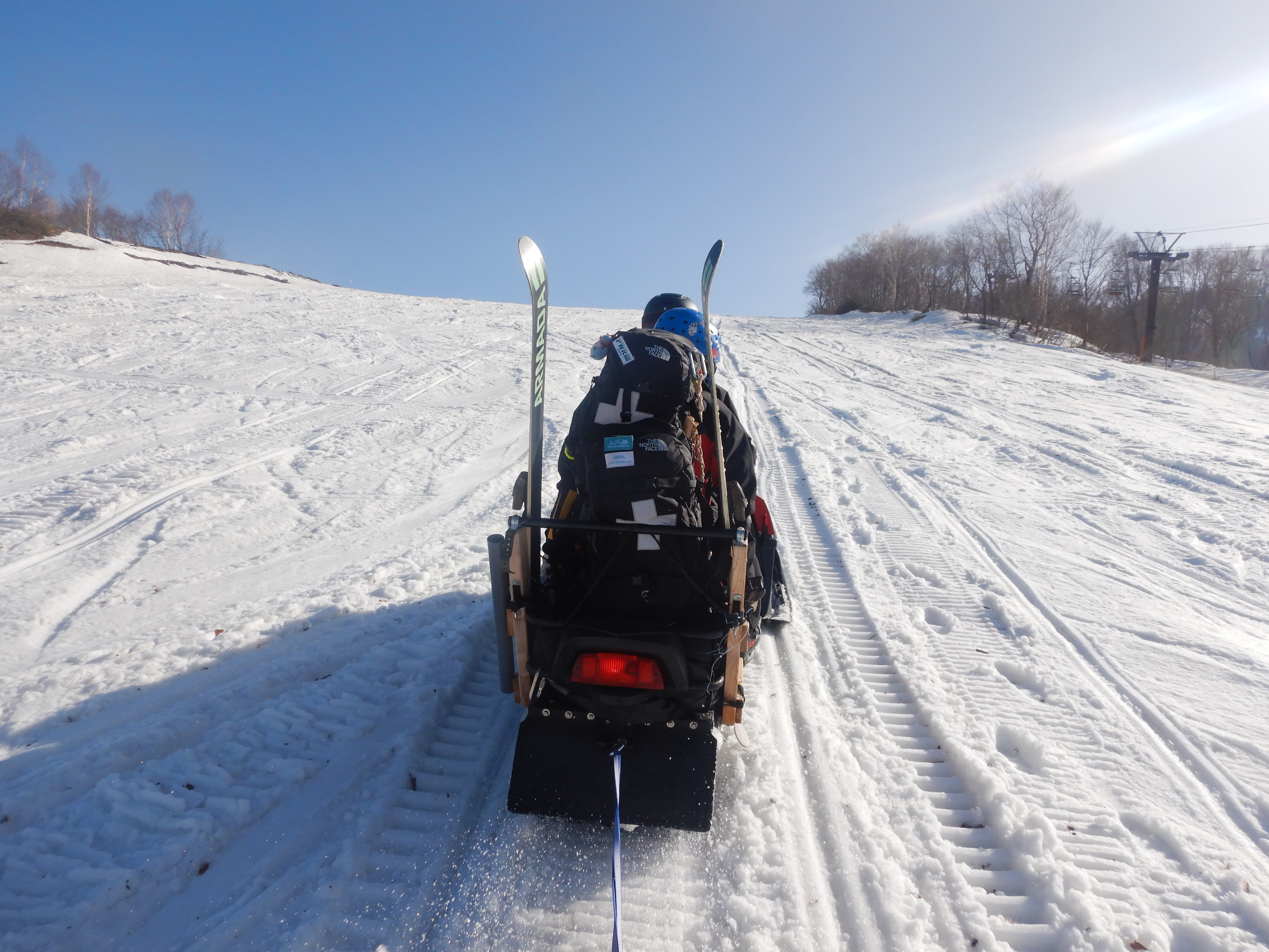 そんなこんなで今日も最終です!午前中にリフトが止まってしまい通常なら圧雪車でアル1終点まで引き上げてもらうのですが、本日は最終を少人数で行ったためモービルで引き上げてもらいました。その後アル3改札まで最終をかけ、改札周りの設置物片付けました。通常ならばその後アル3乗車でゴンドラ下山して終了、となるのですがリフトスタッフがもういない。というわけでスキーを履いての下山、つまり下山コースを滑って下りたわけです。