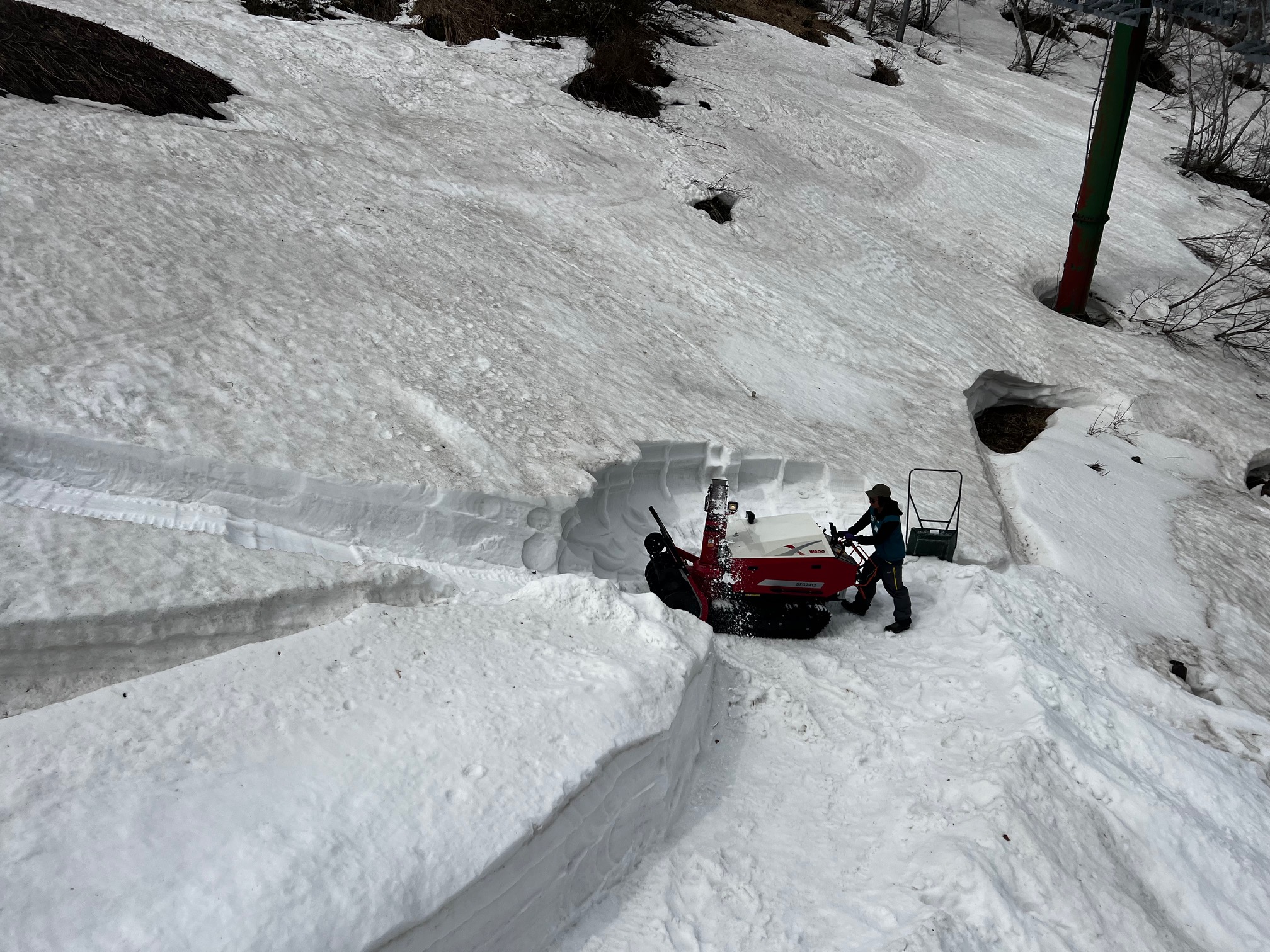 さて一日でも長くゲレンデを維持できるように、あちこち雪の運搬、コースの大改造などが始まっています。
